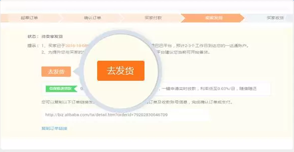 供應(yīng)商在信保訂單詳情,找到待發(fā)貨的訂單,選擇起草阿里物流訂單,或直接上傳發(fā)貨憑證。